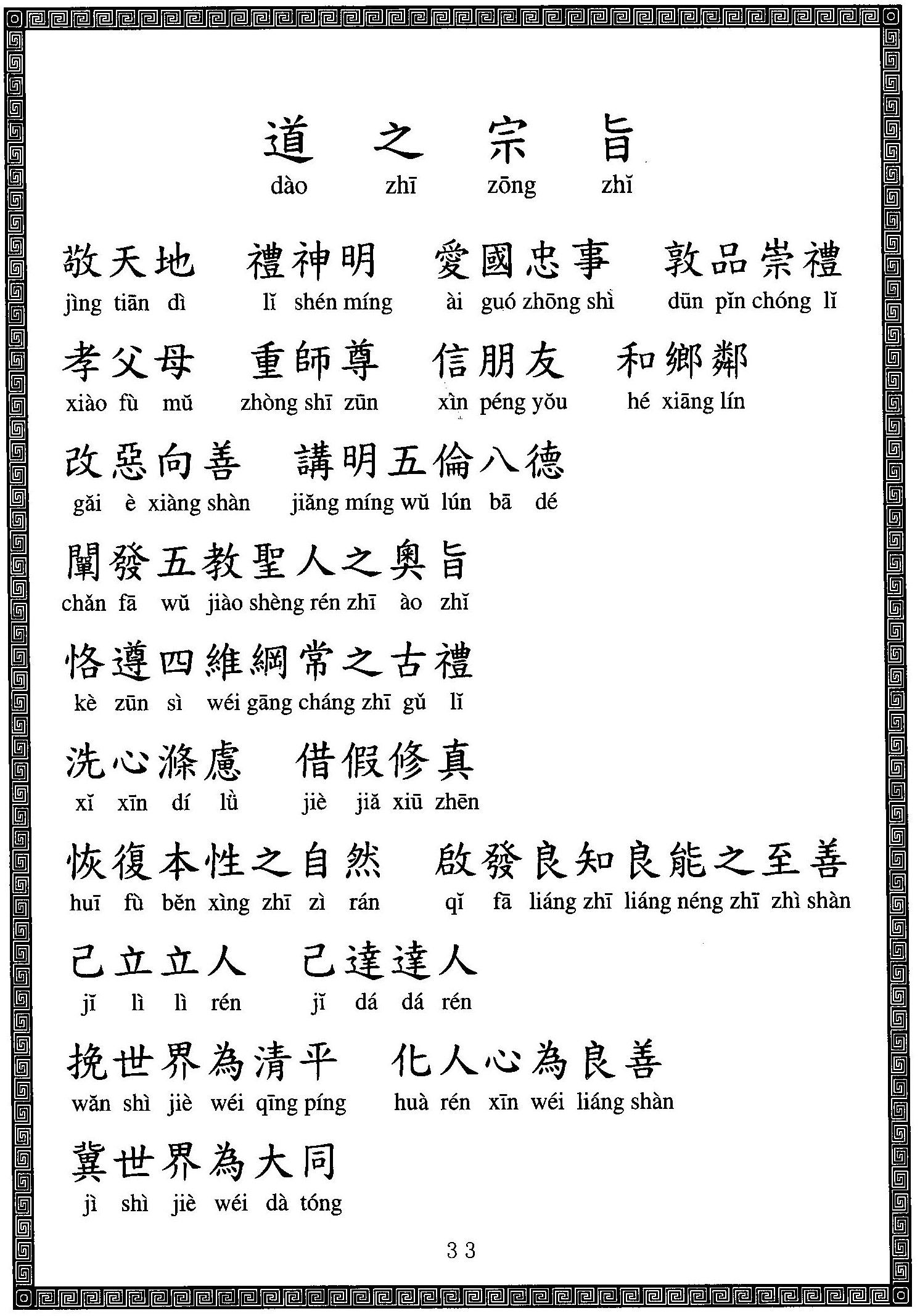 敬天地,禮神明,愛國忠事,敦敬崇禮,孝父母,重師尊,信朋友,和鄉鄰,改惡向善,講明五倫八德,闡發五教聖人之奧旨,遵四維綱常之古禮。洗心滌慮,借假修真,恢復本性之自然。啟發良知良能之至善,己立立人,己達達人。挽世界為清平,化人心為良賢,冀世界為大同,是本道之惟一宗旨。